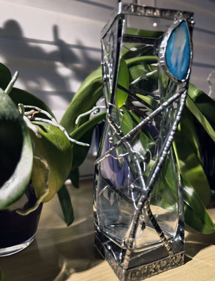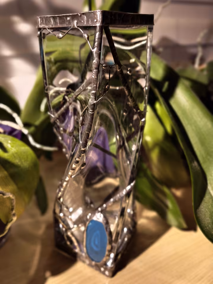 Wazon szklany z agatem 2 szt., wysokość 300 mm, podstawa 90 mm x 90 mm. Drut i blacha miedziana, cyna.