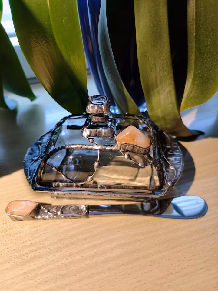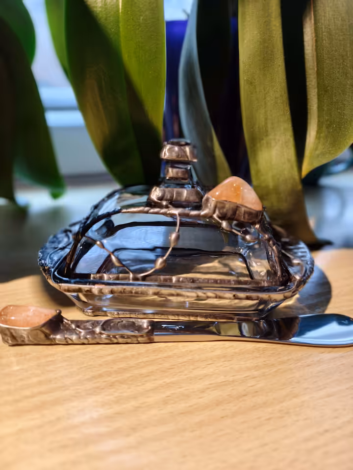 Maselniczka szklana. Wymiary maselniczki: góra 125 mm x 95 mm, dół 170 mm x 110 mm, wysokość 95 mm. Jaspis, drut i blacha miedziana, cyna.