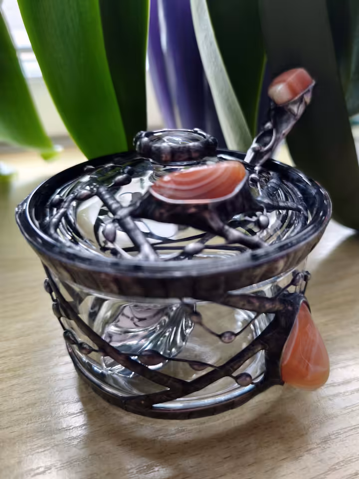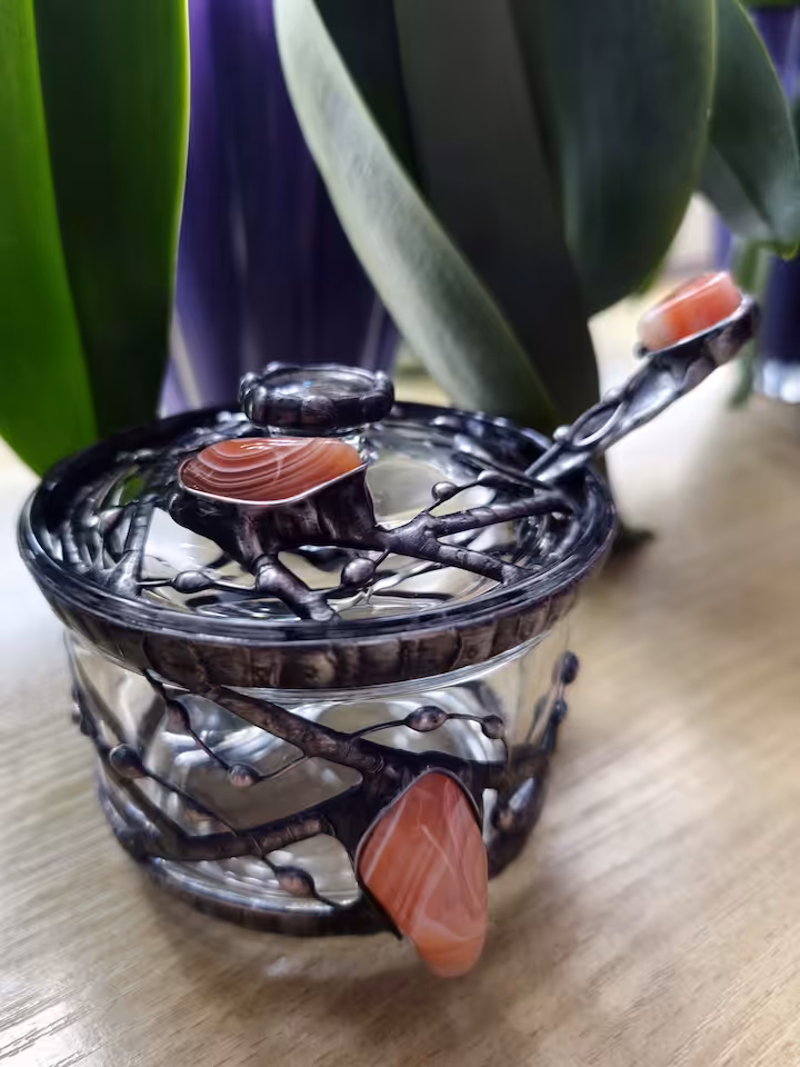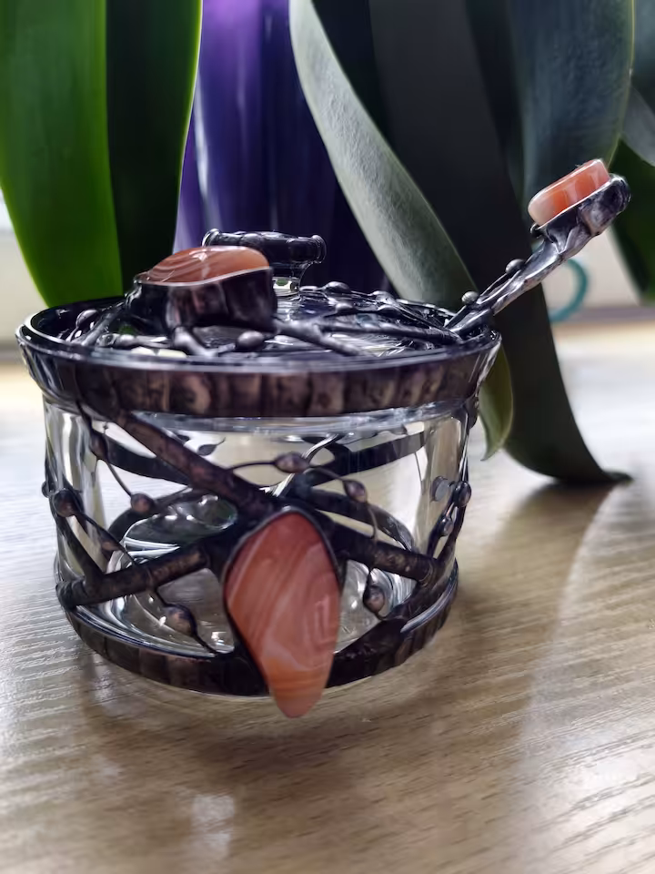 Cukierniczka - kamień Karneol (2 szt.), wymiary cukiernicy góra średnica 100 mm, wysokość 80 mm. Drut i blacha miedziana, cyna.