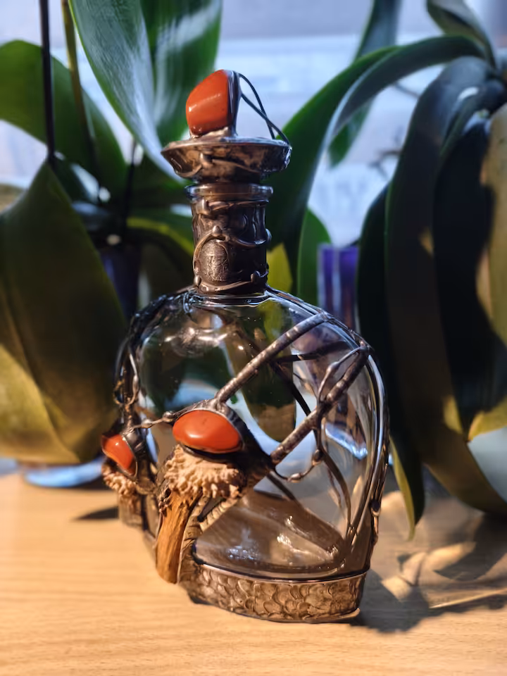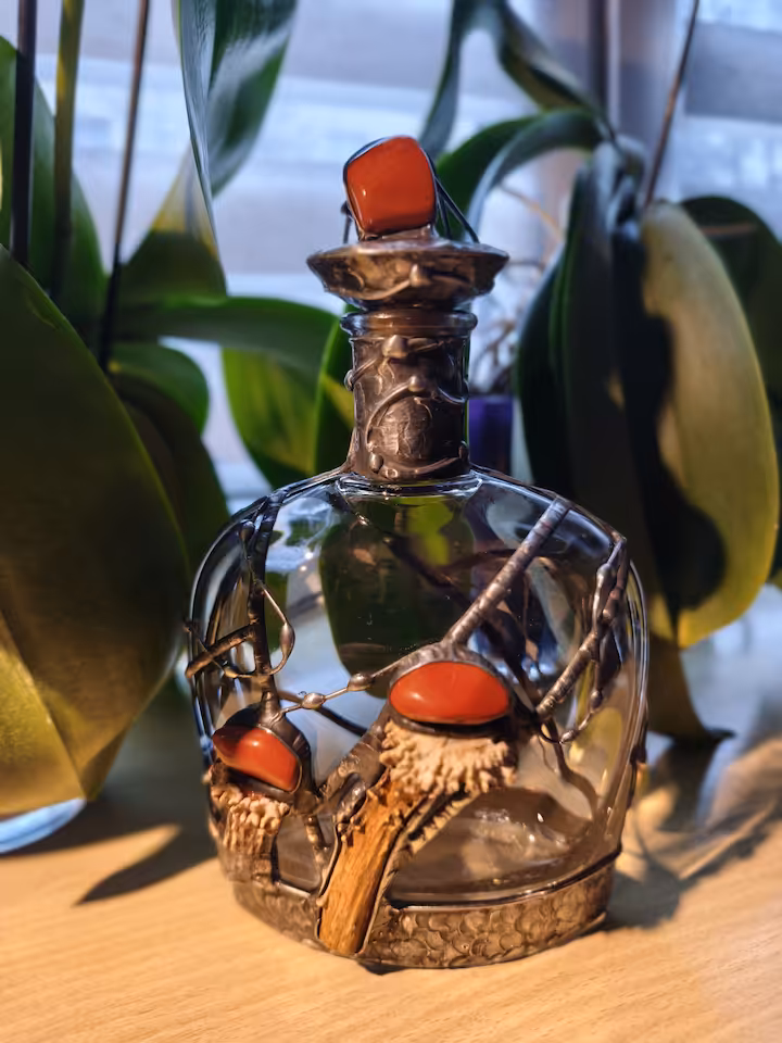 Karafka do nalewek (wódki) 700 ml. Z rogiem koziołka, kamień Jaspis, korek Jaspis, karafka wysokość 240 mm, podstawa 130 mm x 60 mm, drut i blacha miedziana, cyna.