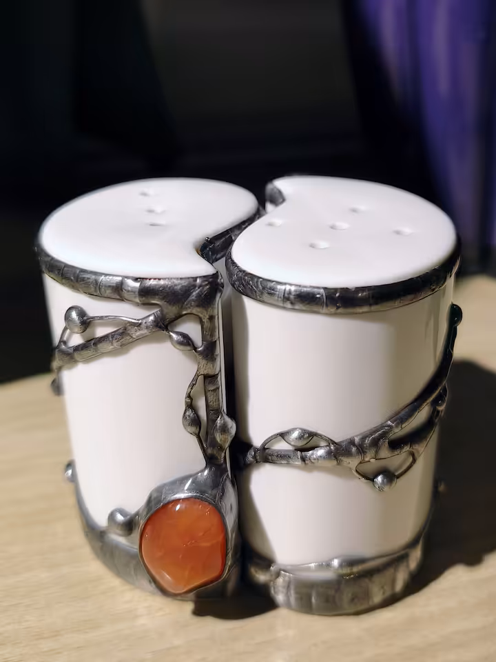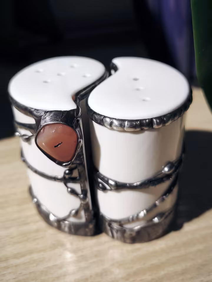 Solniczka i pieprzniczka z karneolem (komplet), wysokość 75 mm, szerokość 60 mm, głębokość 45 mm. Porcelana Ambition.