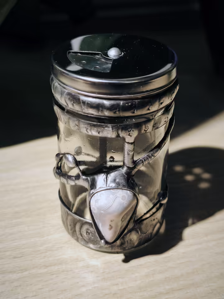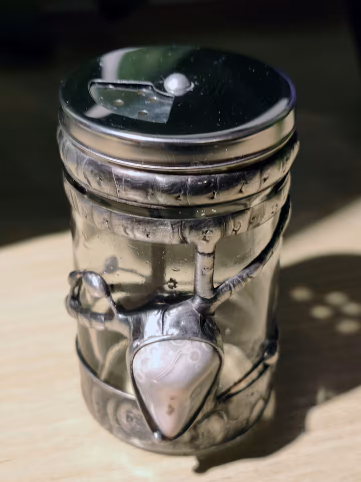 Solniczka (pieprzniczka) z agatem, wysokość 90 mm, średnica góra 35 mm, dół 40 x 40 mm. Zdobienie jest trwałe i nie ulega uszkodzeniu w czasie użytkowania, aby zdobienie na długo zachowało swój blask należy myć go w ciepłej wodzie z dodatkiem płynu do mycia naczyń, można użyć szczoteczki. Zalecane mycie ręczne.