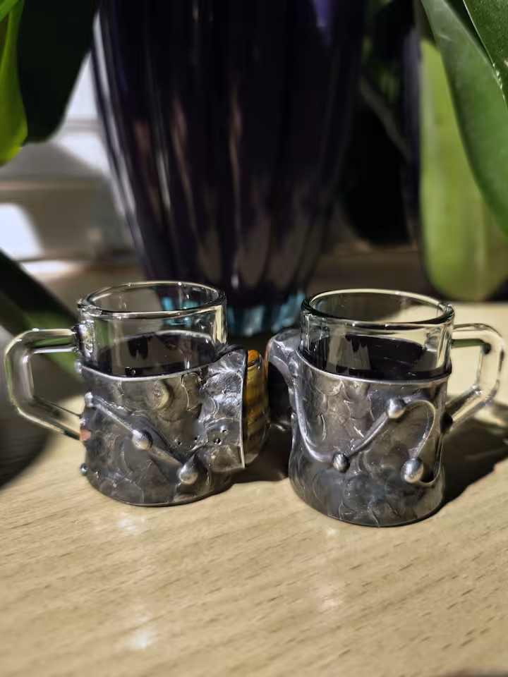 Kieliszek do nalewek (wódki) kamień Tygrysie Oko, pojemność 25 ml, blacha i drut miedziane, cyna.