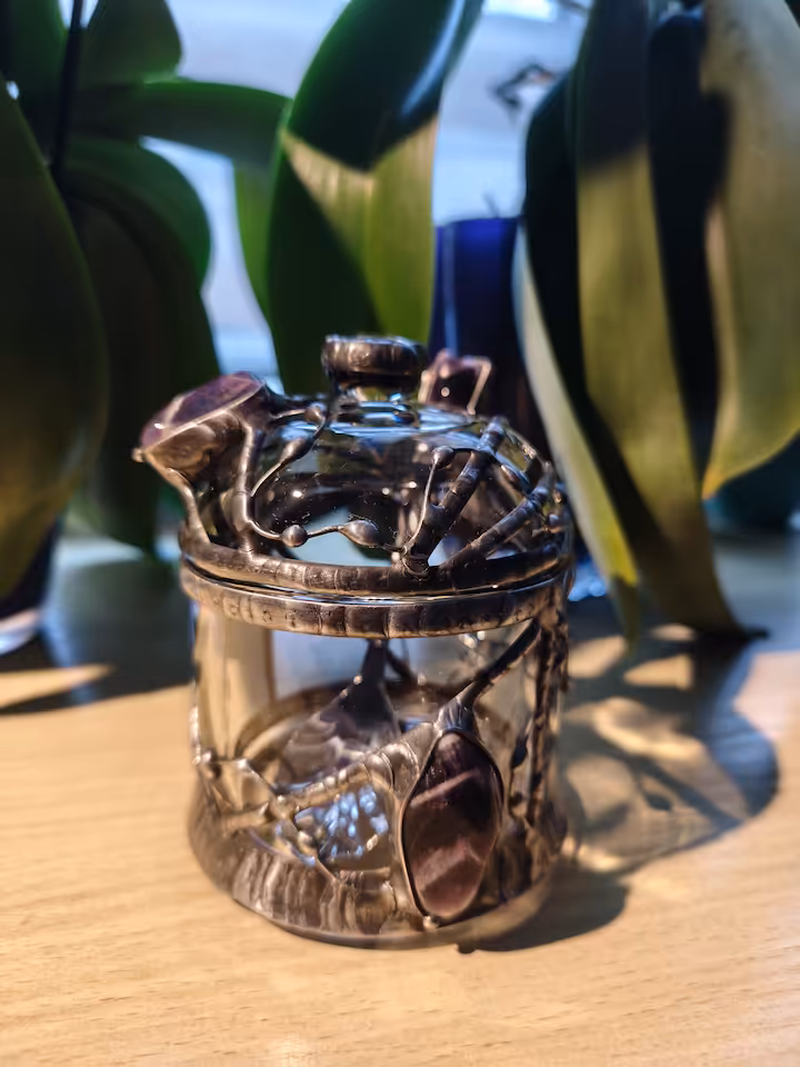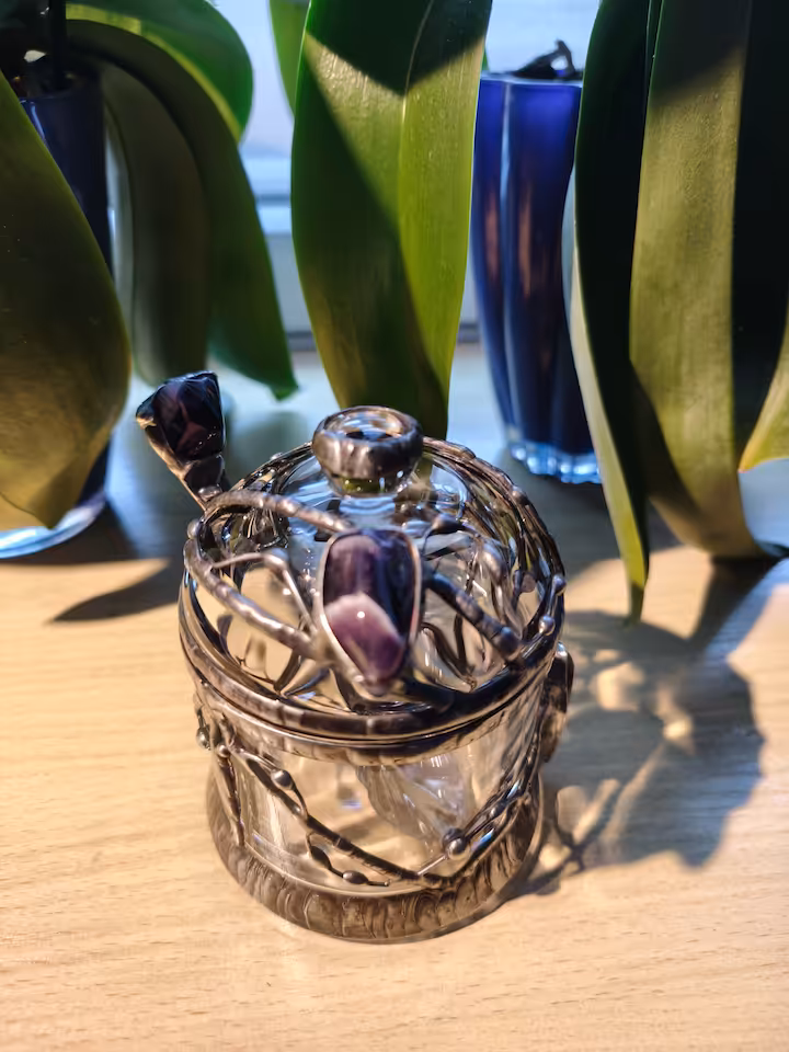 Cukierniczka - kamień Ametyst 2 szt., wymiary cukiernicy góra średnica 90 mm, wysokość 115 mm. Drut i blacha miedziana, cyna.