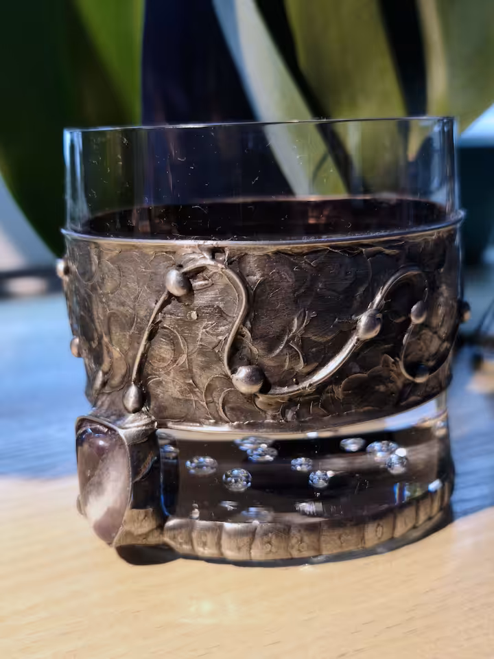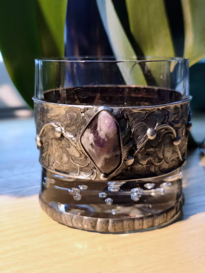 Szklanki do drinków, koktajli - kamień Ametyst. Pojemność 250 ml. Drut i blacha miedziana, cyna.