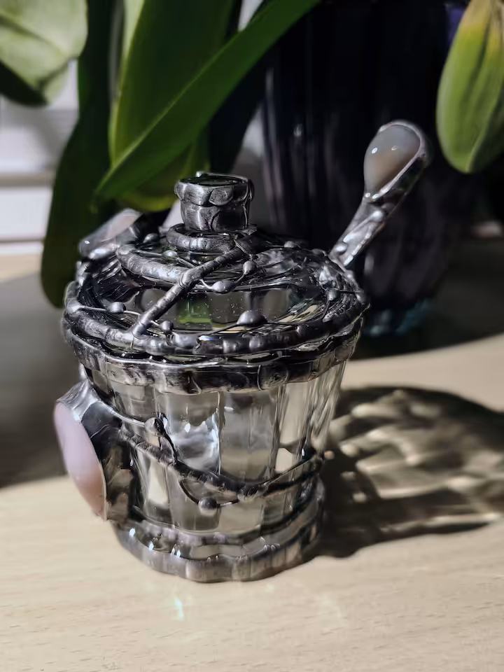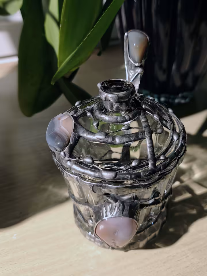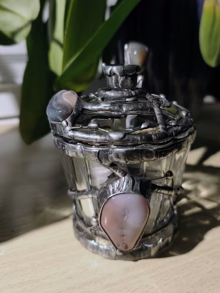 Cukierniczka - kamień Agat 2 szt., wymiary cukiernicy góra średnica 85 mm, wysokość 105 mm. Drut i blacha miedziana, cyna.